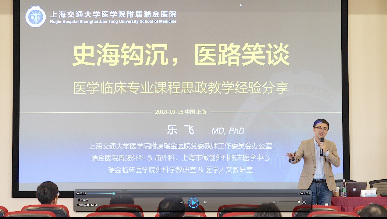 10月16日下午1:00,“课程思政”系列第一课在南苑4号楼3楼A303开讲。瑞金医院疝外科副主任乐飞博士作《史海钩沉,医路笑谈——医学临床专业课程思政教学经验分享》主题报告,全校百余教职工参加了培训,人事处副处长(挂职)李晓欧主持会议。