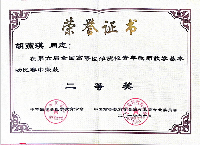 胡燕琪,讲师,硕士研究生,毕业于上海交通大学医学院儿科学专业。2011年进入我校工作,长期承担儿科学相关教学工作。2015年获上海健康医学院教学能力竞赛三等奖;2016年荣获“全国第六届医学(医药)院校青年教师教学基本功比赛”二等奖;2016年上海健康医学院“教学标兵”称号; 2017年东方医学教育论坛论文交流一等奖;2018年获中华医学会医学教育分会百篇优秀论文二等奖。近三年在I类核心期刊上发表论文3篇(第一作者)。