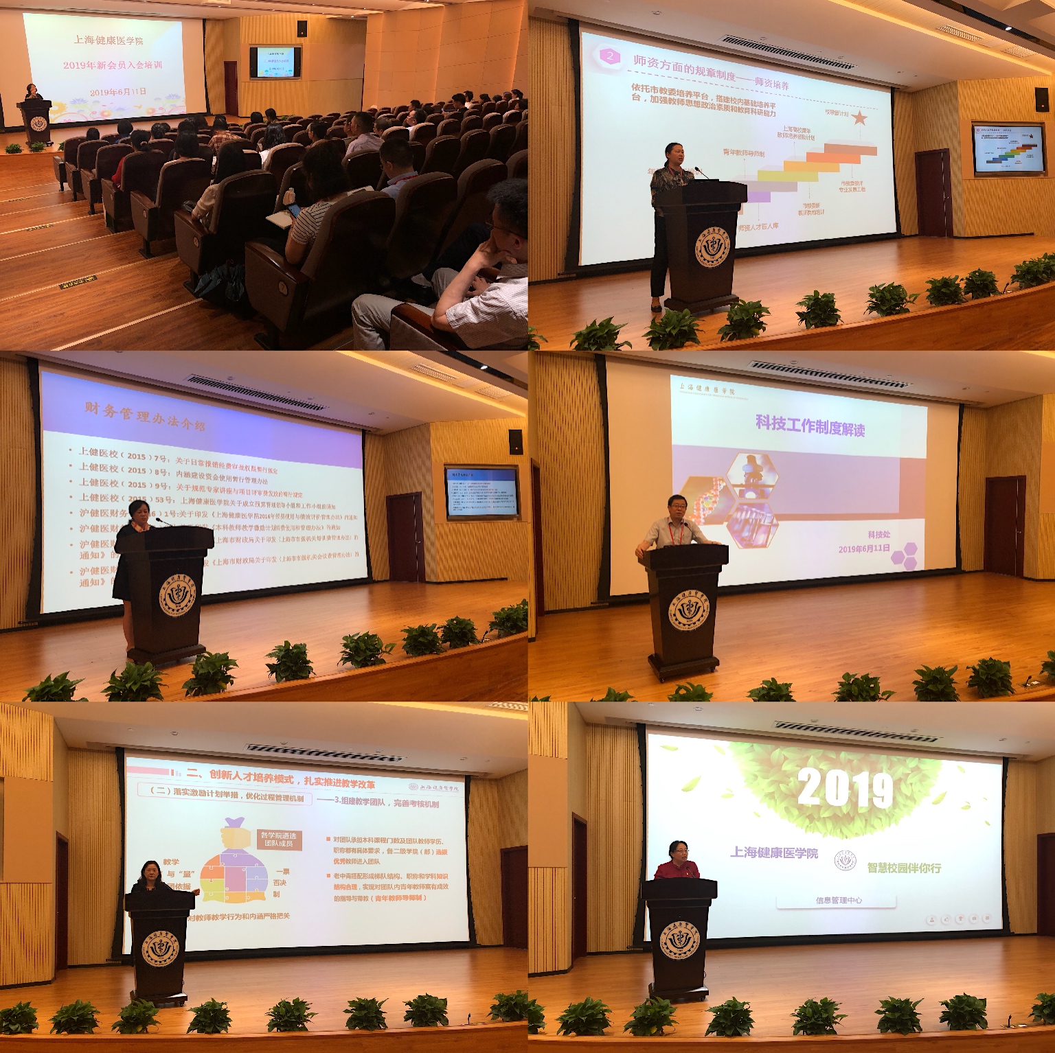 工会副主席凌文惠介绍了工会的性质、职能及职责,以及上海健康医学院工会和妇委会的工作内容;人事处处长金东英介绍了人才引进和招聘、师资培养、职称评审及聘任,以及劳资方面的人事制度;财务处蔡敏科长介绍了财务管理制度、网上预约报销系统、报销常见问题与需要注意的事项;科技处莫国民处长介绍了论文级别及分类、科研经费、科技成果等方面的科研管理制度;教务处张梅处长解读了教学规范与要求、教育教学改革、教学能力发展方面的教务制度;信息管理中心王莉主任介绍了智慧校园、网站群、E办事、I健康等与教师切身相关的信息服务体系。